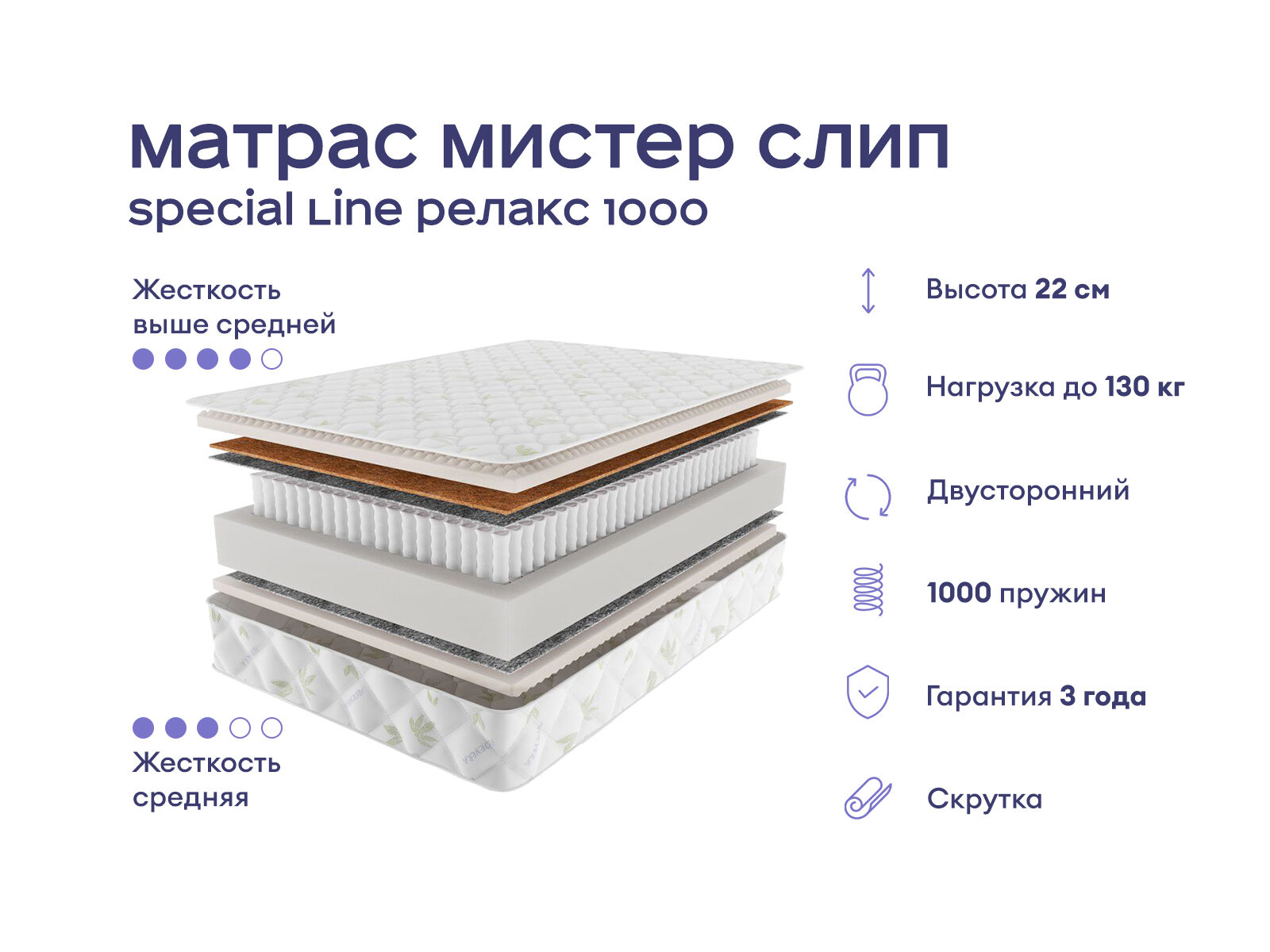 Матрас для комфортного сна и полноценного расслабления. Модель объединяет массажный эффект, ортопедическую поддержку и универсальную двойную жёсткость. Средняя и выше среднего мягкость сторон позволяют настраивать комфорт спального места под свои предпочтения.