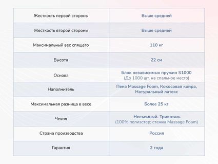 Двусторонний матрас Relmas Mix S1000 соответствует уровню жёсткости выше среднего. Модель дополнена массажной функцией – обе спальные поверхности изделия оказывают деликатное воздействие на тело.