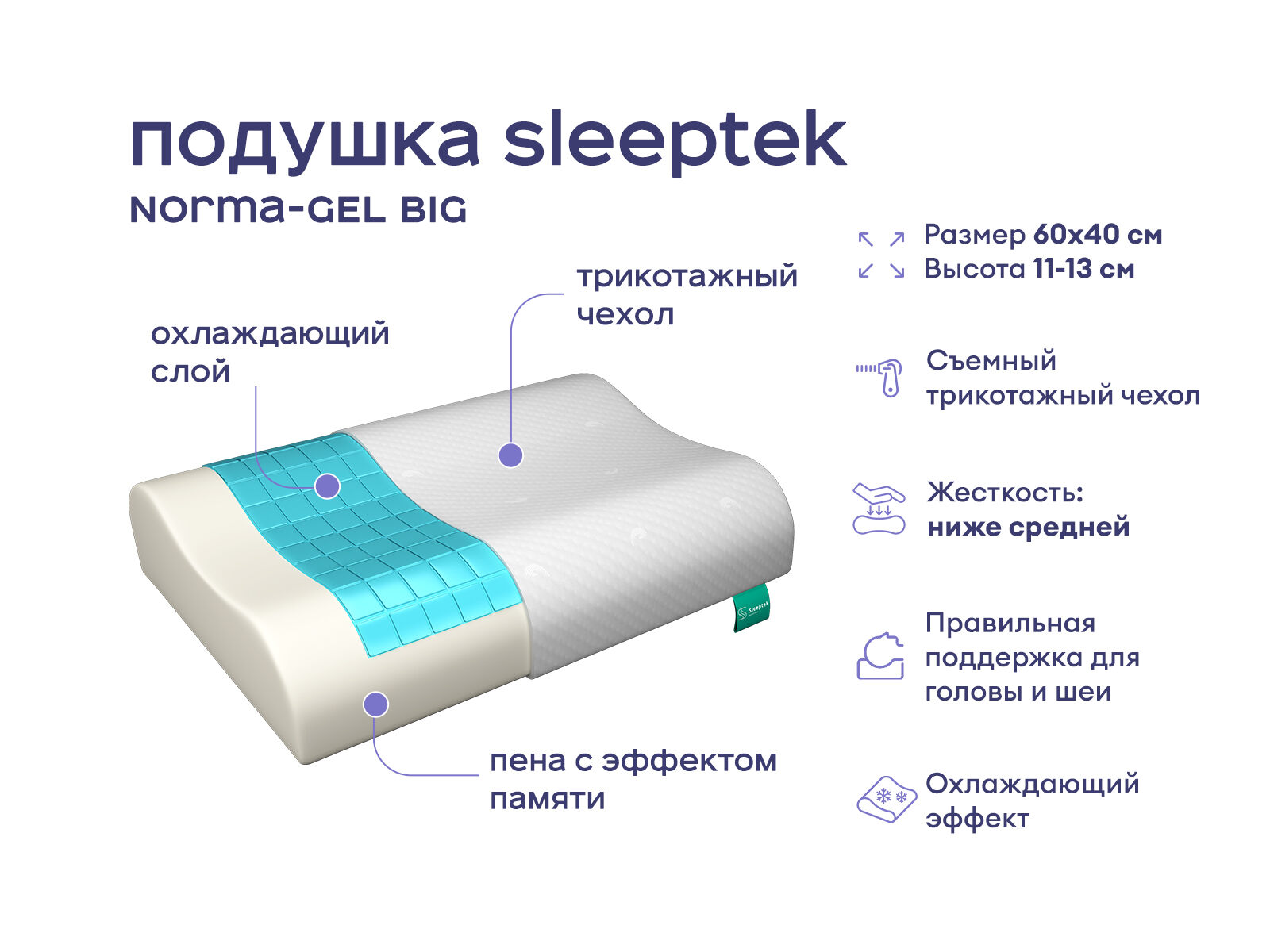 Модель эргономичной формы с двумя валиками разной высоты – 11 и 13 см, которая подарит оптимальную поддержку головы и шеи во время сна. Наполнителем служит эластичная пена мемори, обладающая эффектом запоминания формы. Мемори помогает снять накопившееся за день напряжение, а также исключает эффект обратного давления. На поверхности подушки размещен охлаждающий гель, который дарит ощущения легкой прохлады, что благотворно влияет на качество сна. Подушка способствует улучшению кровообращения и снятию отеков.