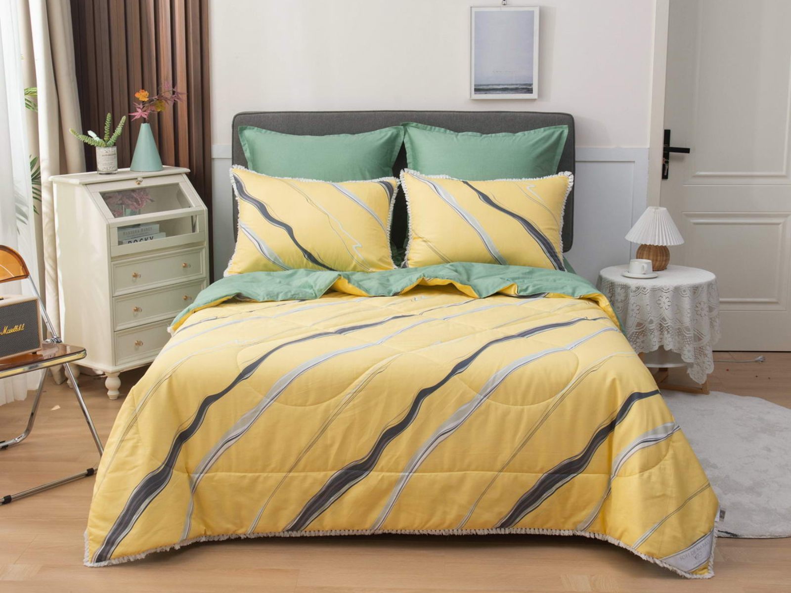 В комплекты комфортеров с одеялом Бернадетт входят наволочки, простыня и легкое всесезонное одеяло. Оцените это современное и очень удобное решение, которое идеально подходит тем, кто не любит возиться с пододеяльниками.