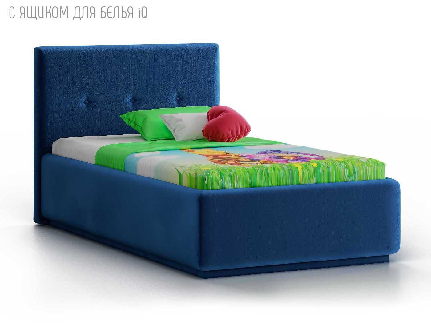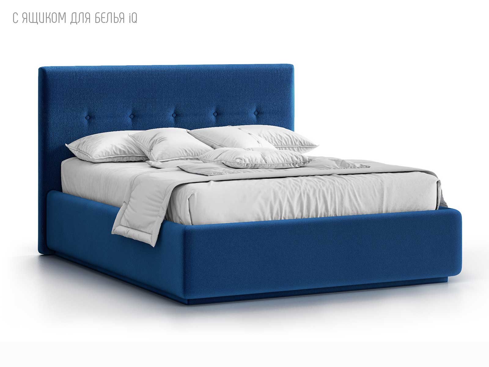 Кровать укомплектована IQ с подъемным механизмом и ящиком для белья без дна (дополнительная платная опция - дно к ящику IQ из HDF (ХДФ). Каркас кровати на цоколе, декоративный чехол на цоколе съёмный. Глубина ящика для белья - 30 см, без ограничения нагрузки на ящик.