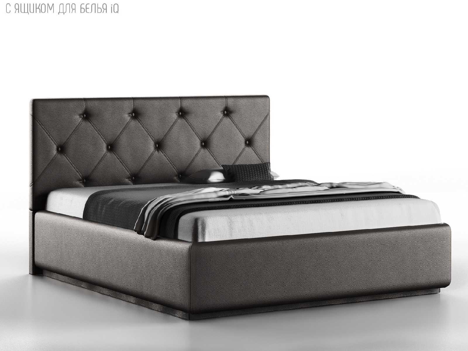 Кровать укомплектована IQ с подъемным механизмом и ящиком для белья без дна (дополнительная платная опция - дно к ящику IQ из HDF (ХДФ). Каркас кровати на цоколе, декоративный чехол на цоколе съёмный. Глубина ящика для белья - 30 см, без ограничения нагрузки на ящик.