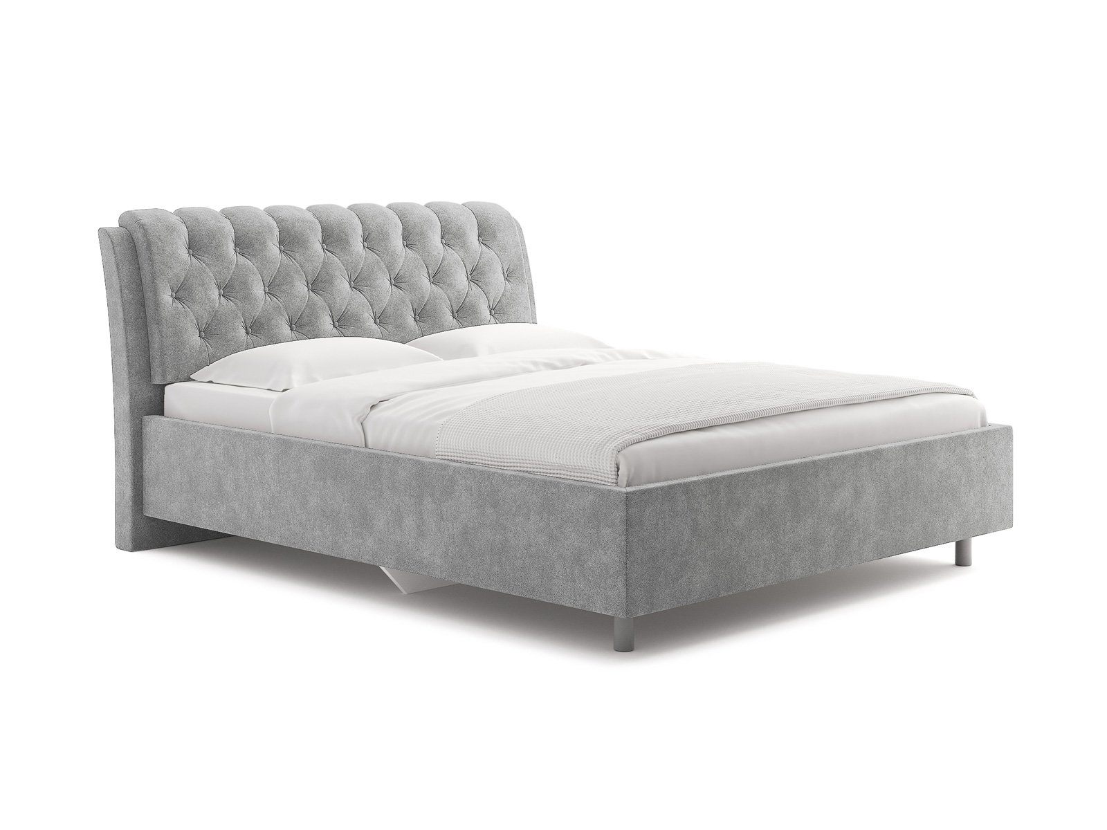 Элегантная интерьерная кровать с изголовьем, украшенным декоративными пуговицами и глубокой пиковкой. Модель изготовлена из ДСП.