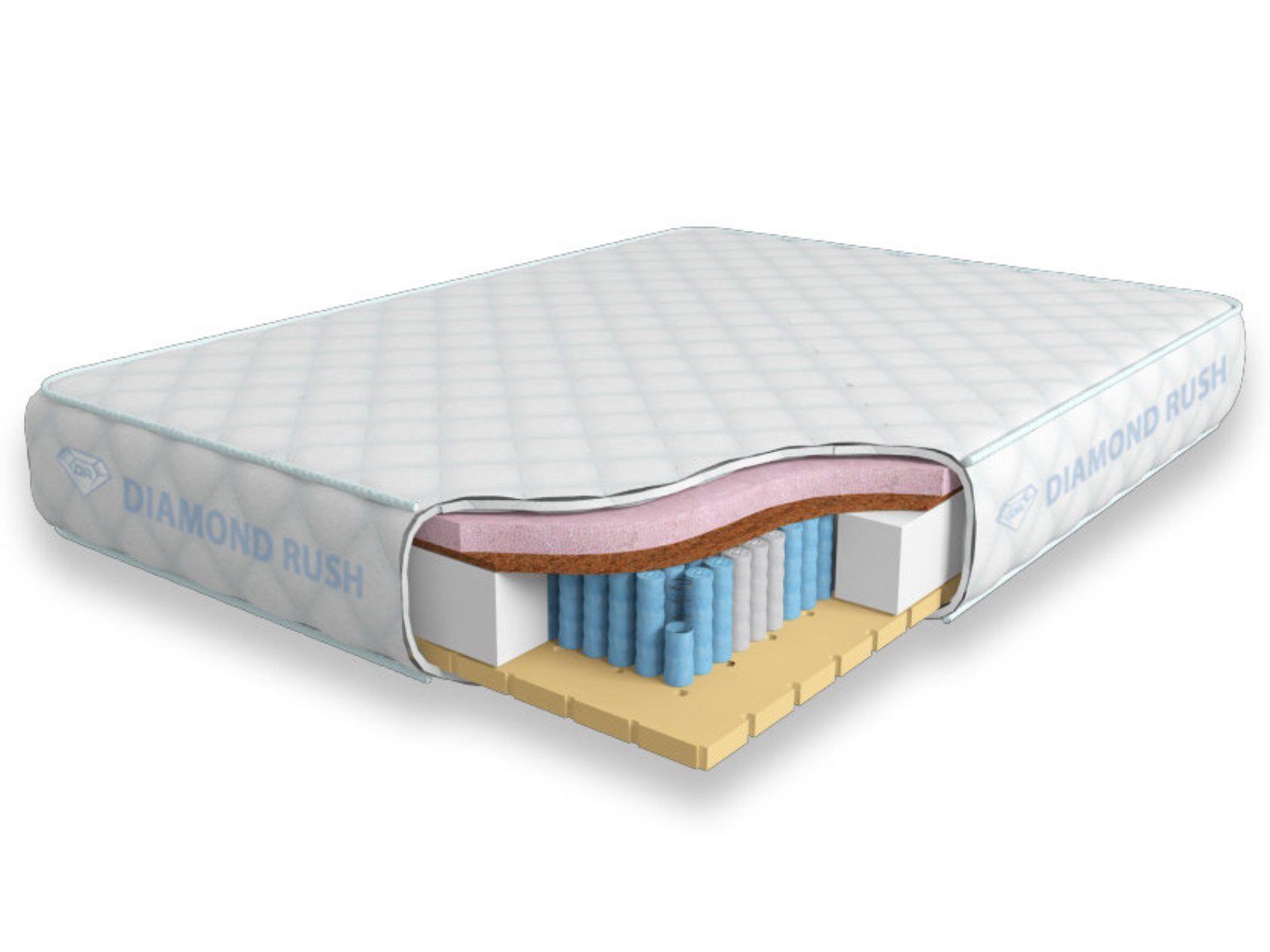 Матрас из серии Luxury Diamond имеет в своей основе независимый пружинный блок MultiZone, состоящий из пружин диаметром 3-4 см разной жесткости. В качестве настилочных слоев поверх пружинного блока используются такие материалы, как перфорированный натуральный латекс, кокосовая койра и вязкоэластичный Меморикс, обладающий эффектом памяти. Стороны матраса различаются по жесткости.