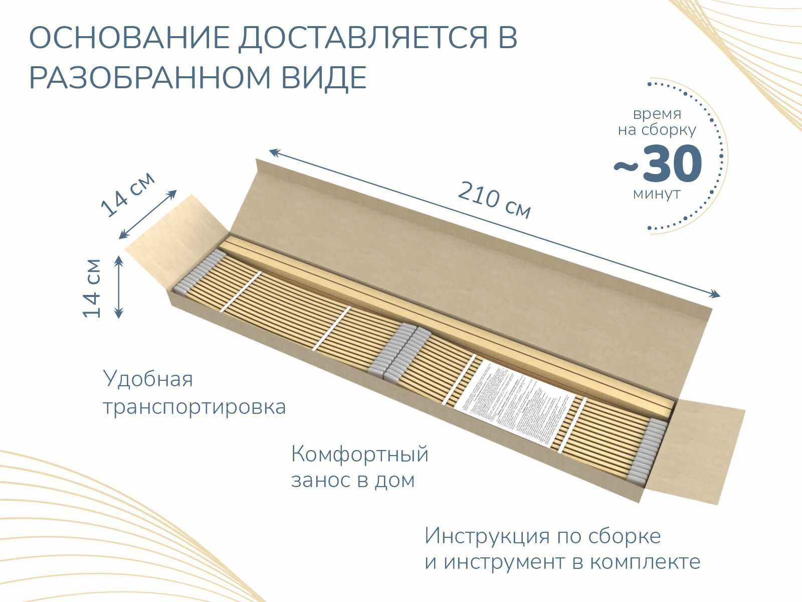 Деревянное основание без ножек для любых беспружинных матрасов и матрасов с пружинным блоком Bonnel и TFK, вкладывается в кровать на царги. Рама изготовлена из клееной фанеры из березы сечением 50х25мм. Латы березовые, латодержатели пластиковые.