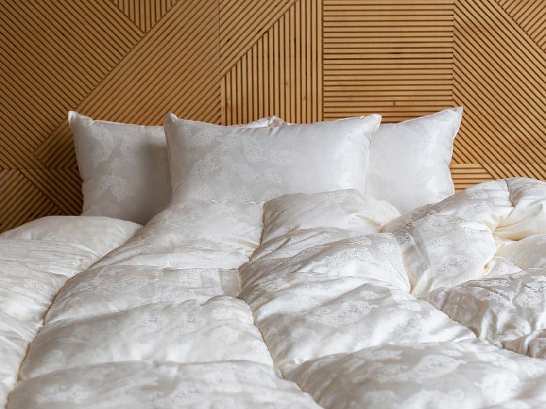 Сочетание сливочного пуходержащего жаккардового сатина PAISLEY из натурального 100% шелка и первоклассного пухового наполнителя категории “Экстра” повышенной упругости (Fill Power не менее 850 ед.) – это совершенный эксклюзив в мире постельных принадлежностей. Высокая плотность ткани и двойная отстрочка не позволят пуху мигрировать из изделия и не пропустят частички пыли внутрь. Эксклюзивные ткани создаются на единственном производстве в Европе – старейшей немецкой ткацкой фабрике – в лимитированном количестве. Для того, чтобы ткать шелковый пуходержащий жаккард с узором, необходимо обладать высочайшим уровнем мастерства. Кассетные одеяла ручной работы предназначены для использования в холодное время года. Каждая кассета размером 30х30 см наполнена отборным белым пухом вручную. Как и всякий эксклюзив, изделия этой коллекции требуют особого ухода при обслуживании: мы не рекомендуем их стирать, допускается только сухая чистка изделий.